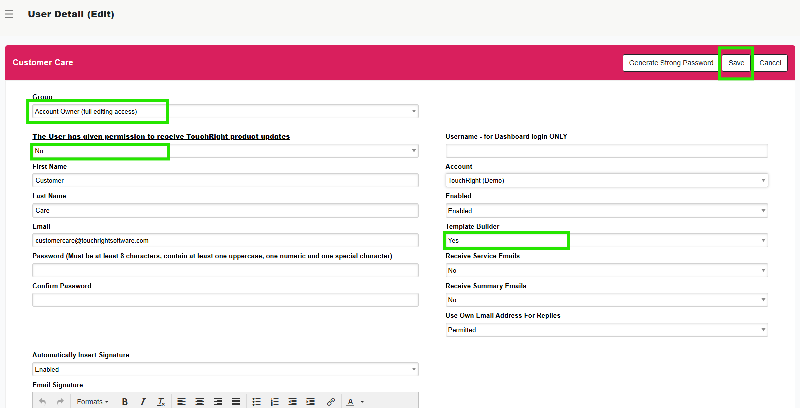 Insert email signature - if the user is likely to send reports out from TouchRight (email signatures can be added/edited later).