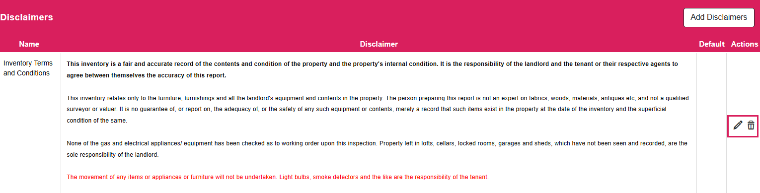 You can also choose to edit or delete disclaimers, using the icons in the Actions column.