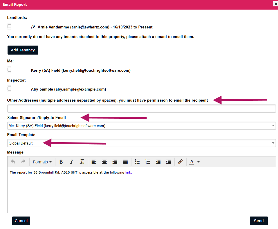 Select the recipients from the available saved landlords or tenants, or you can input the emails separately.