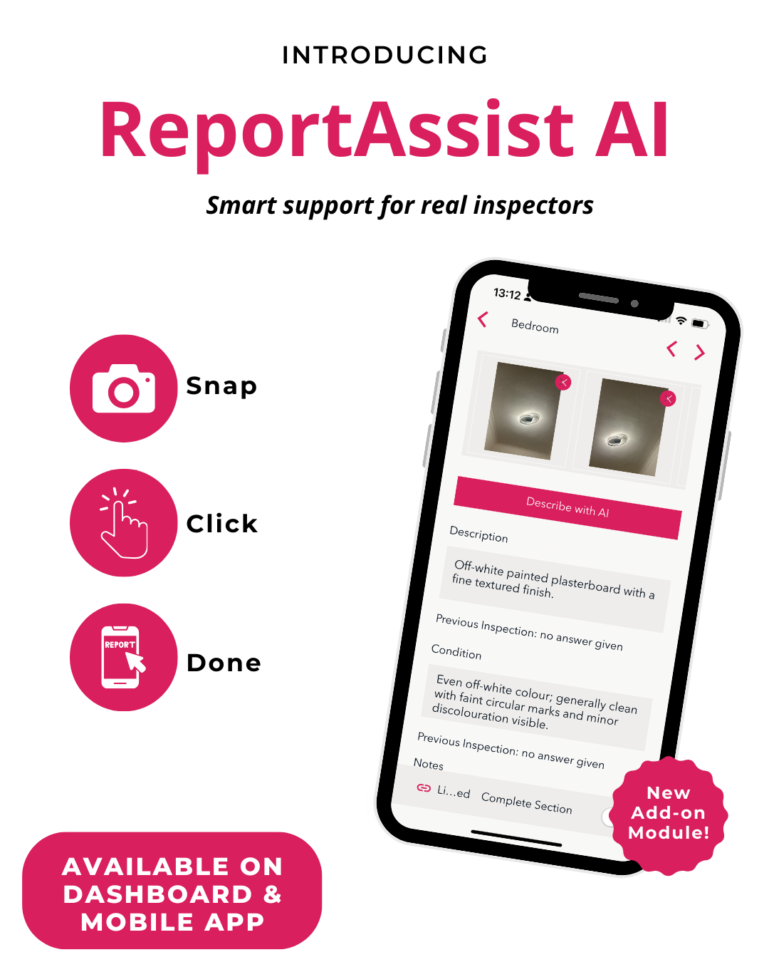 ReportAssist uses AI to help describe and assess condition directly from your inventory photos. Simply take a photo, upload it into your inventory, and ReportAssist will automatically generate a clear description and condition assessment based on the image provided.