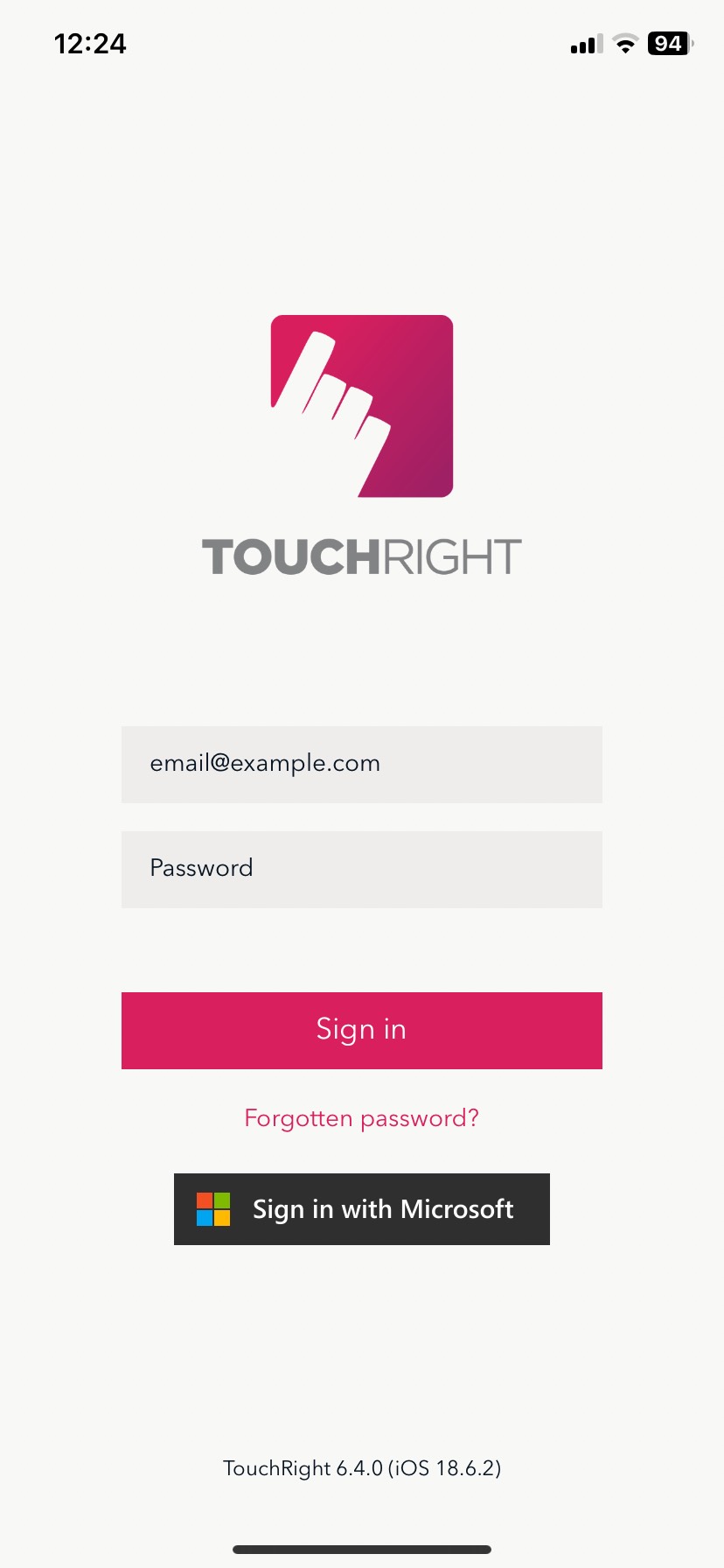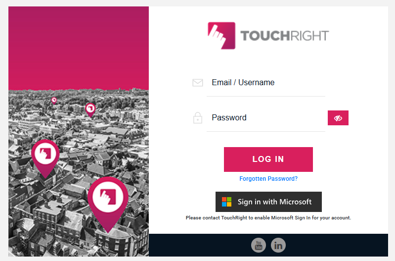 If your organisation uses Microsoft Azure for Single Sign-On to ensure that the right people have access to the right resources, that can be implemented with TouchRight (visible on the login page just below the standard email and password login options).